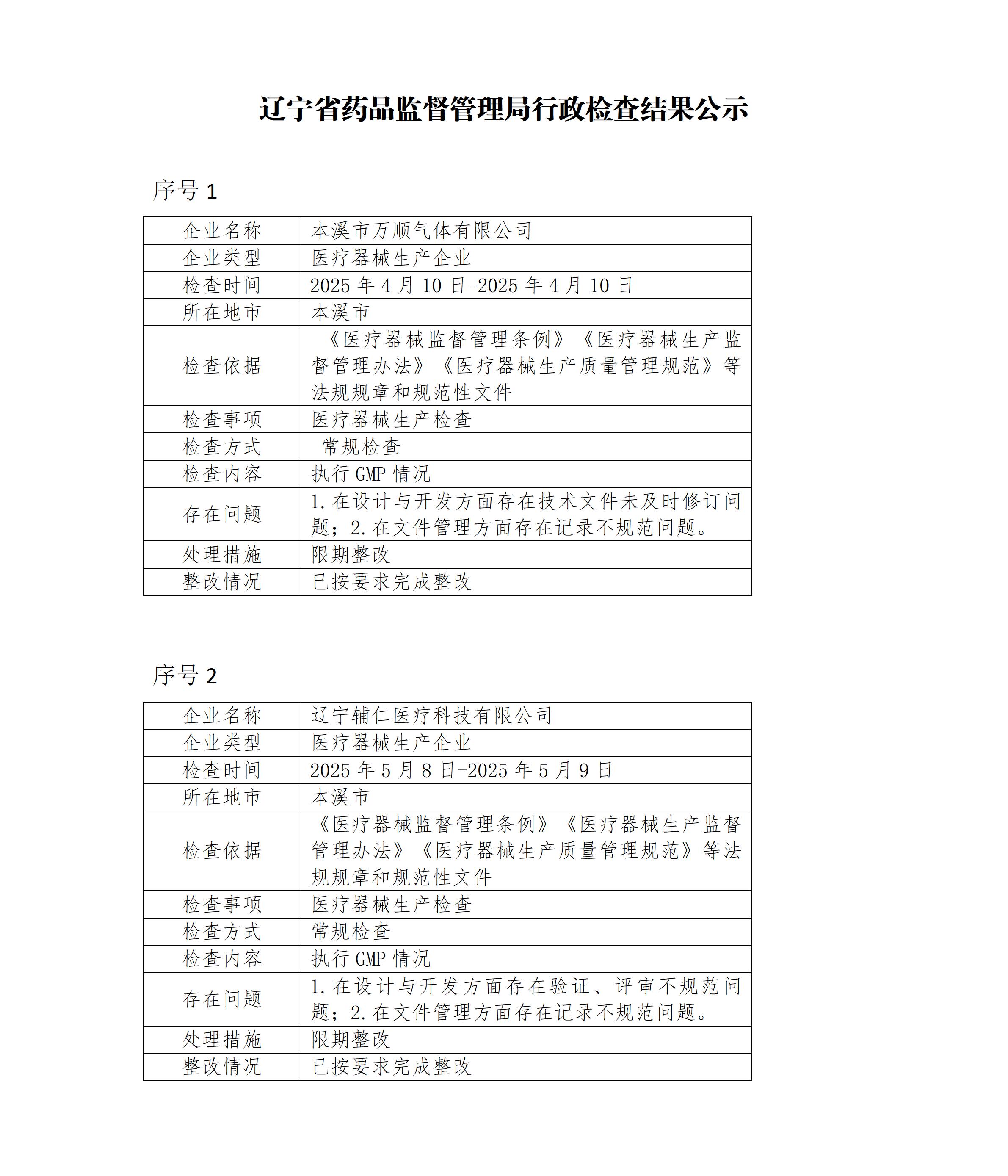 辽宁省药品监督管理局行政检查结果公示(2025年第301期)