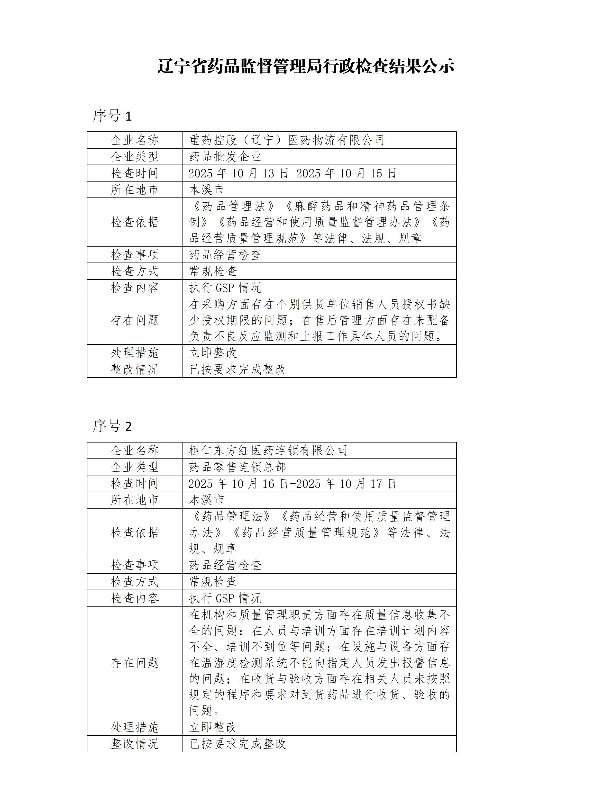 辽宁省药品监督管理局行政检查结果公示(2025年第325期)