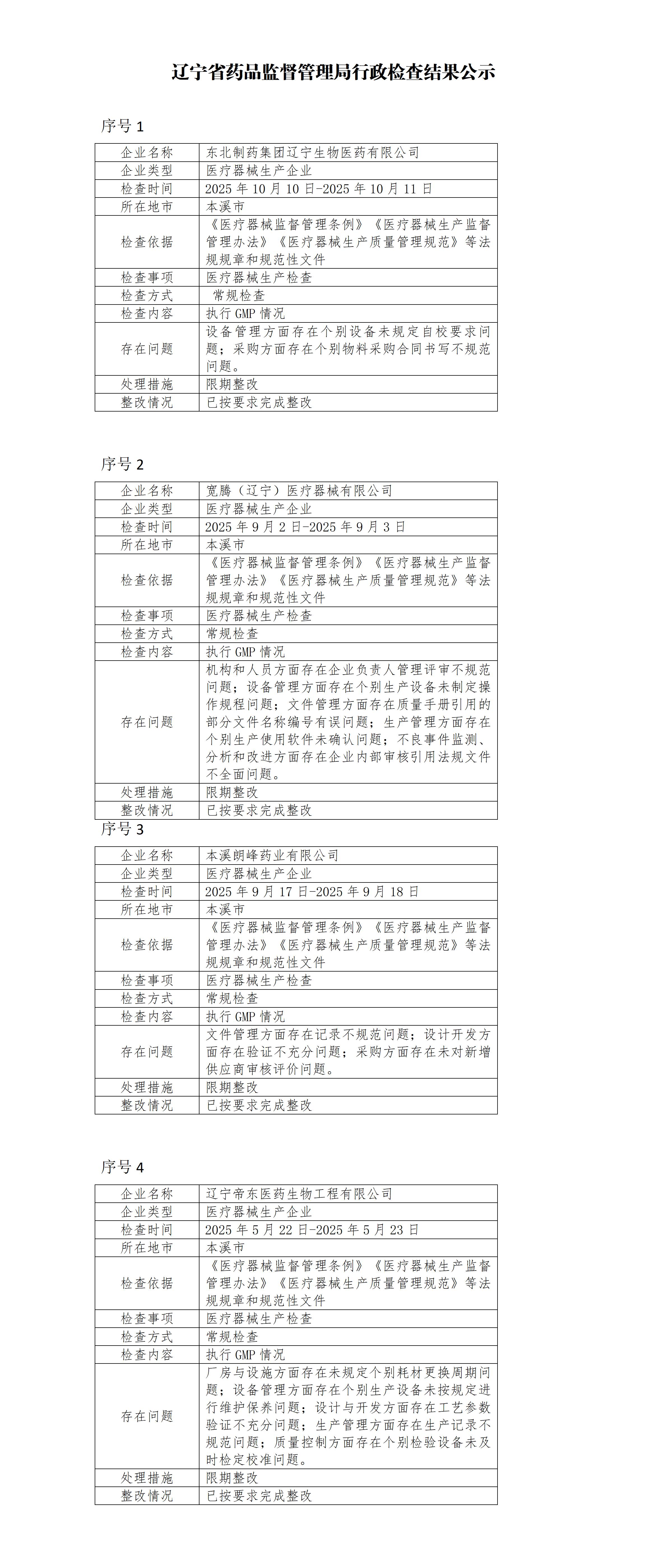 辽宁省药品监督管理局行政检查结果公示.(2025年第353期)