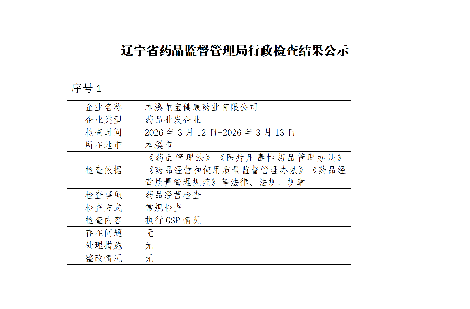 辽宁省药品监督管理局行政检查结果公示(2026年第34期)