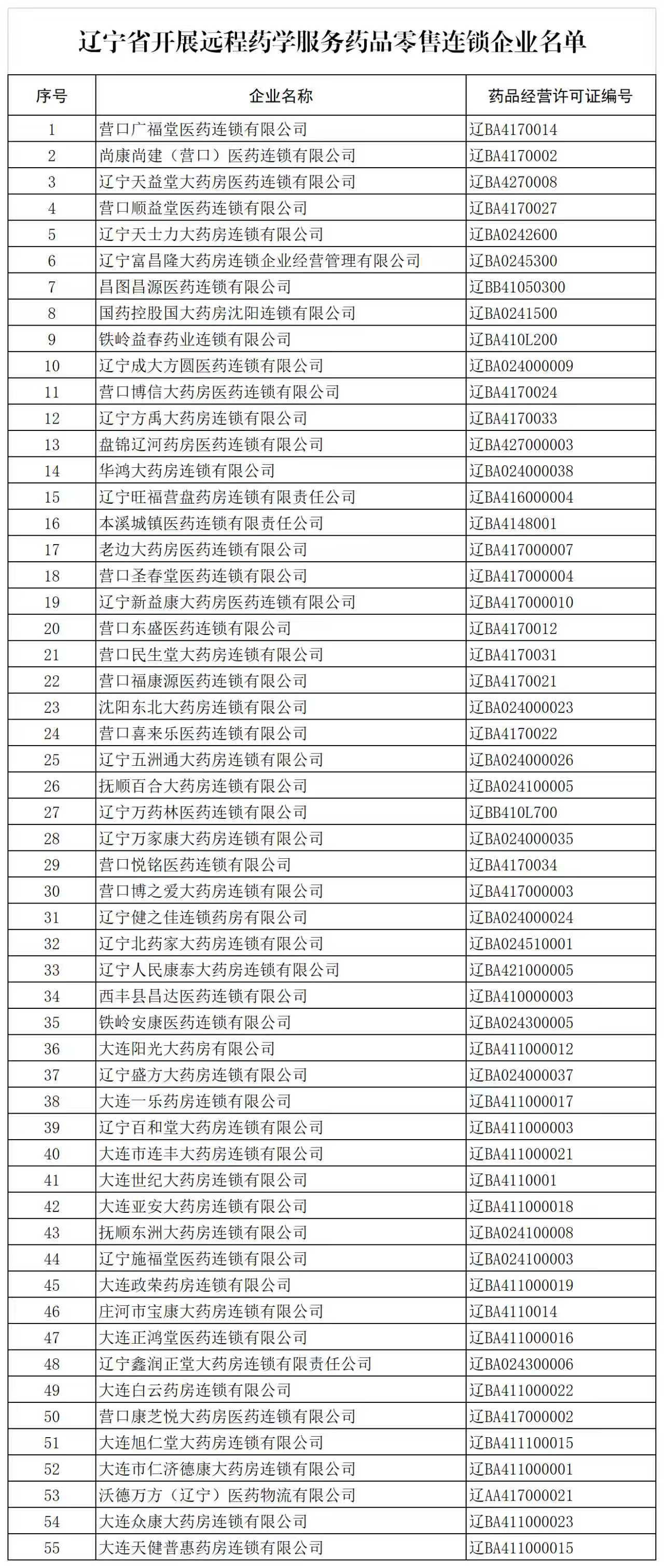 辽宁省开展远程药学服务药品零售连锁企业名单